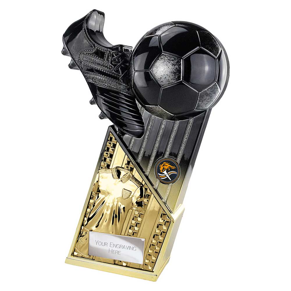 Marauders boot and ball trophy 280mm in carbon black and gold with gold shirt front. Engraving plate and club logo can be applied to the front.Angular hard scratch proof plastic shell with weighted base.