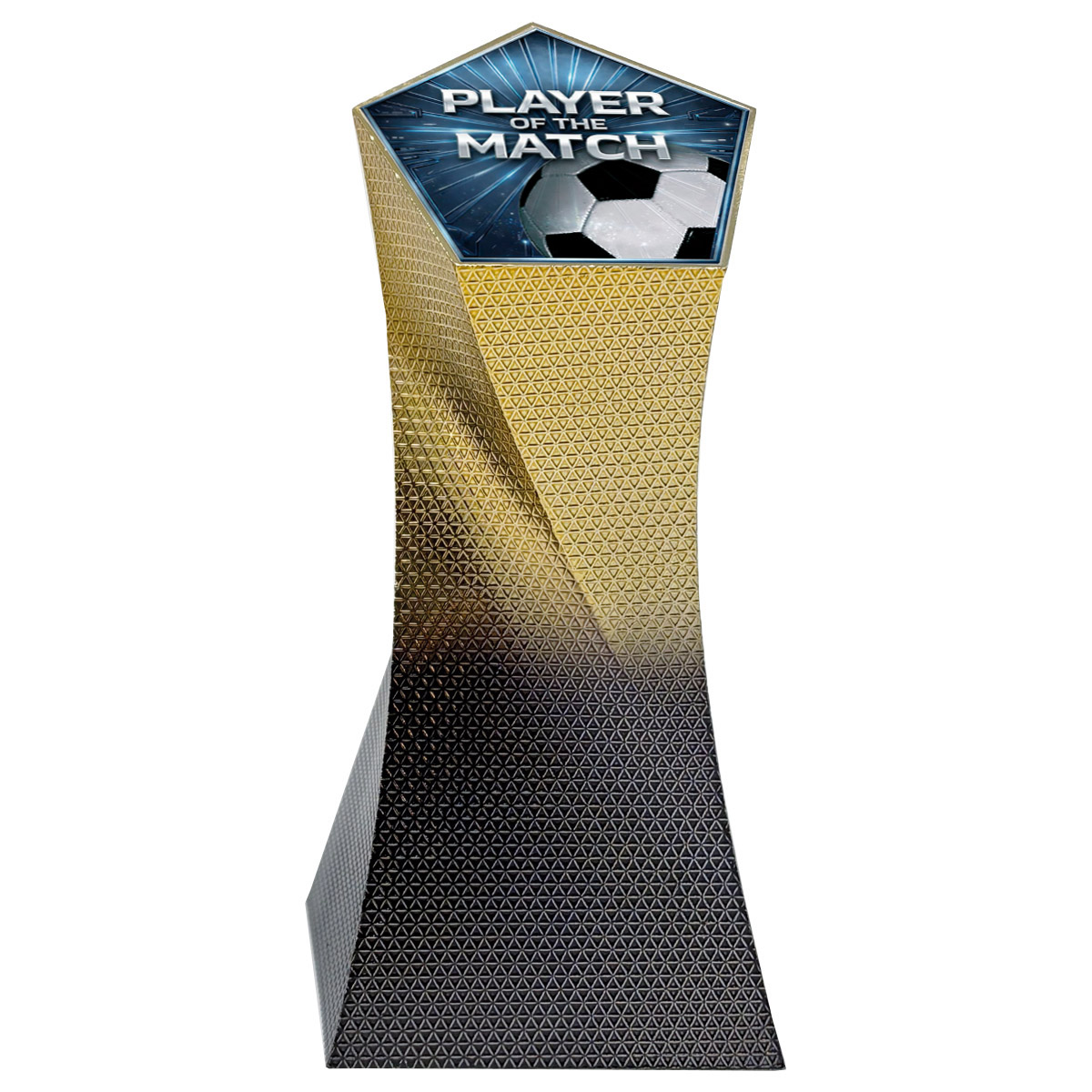 A striking and stylish large modern heavyweight hard shell football trophy with a gold 5 sided column. With an eye-catching premium look this sleek black and gold award is a smart presentation trophy. Player of the Match decal on the top.