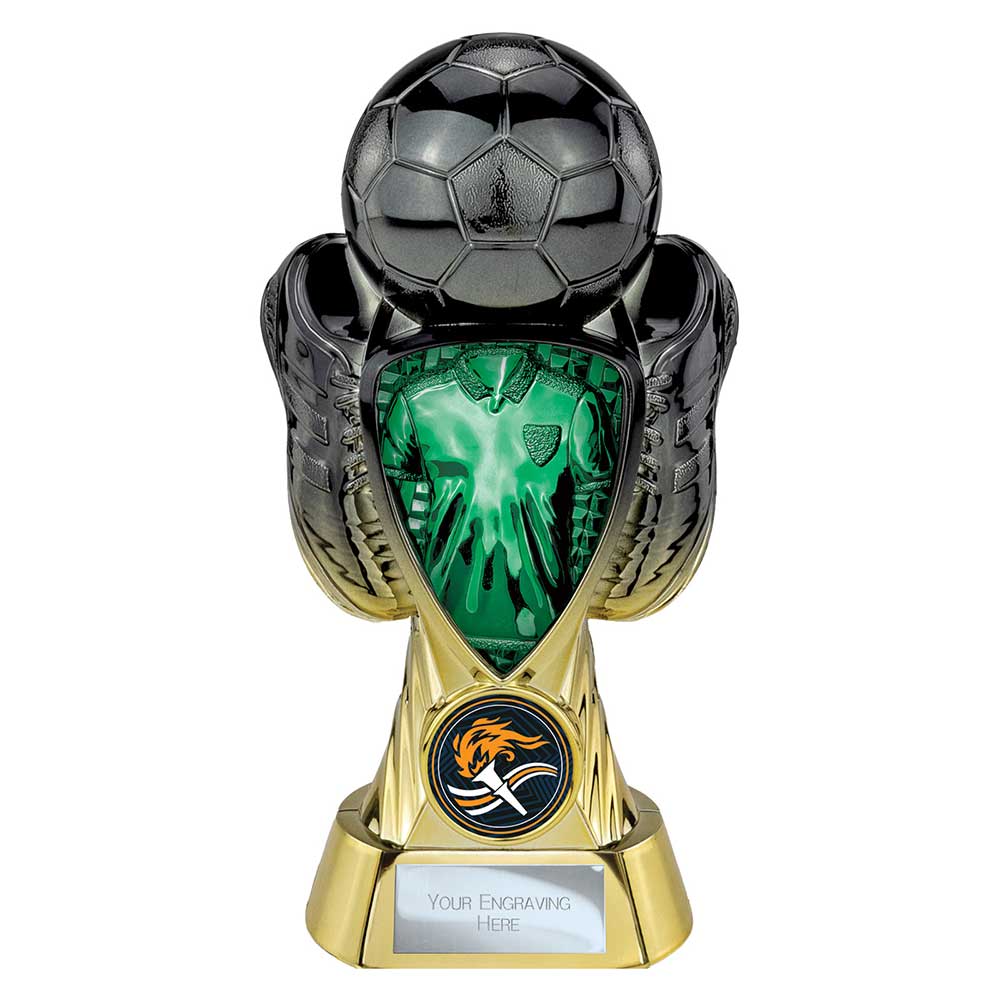 Tournament boot and ball trophy 170mm in carbon black and gold with green shield. Engraved plate and club logo can be applied to the front. Evenly weighted hard scratch proof plastic shell.
