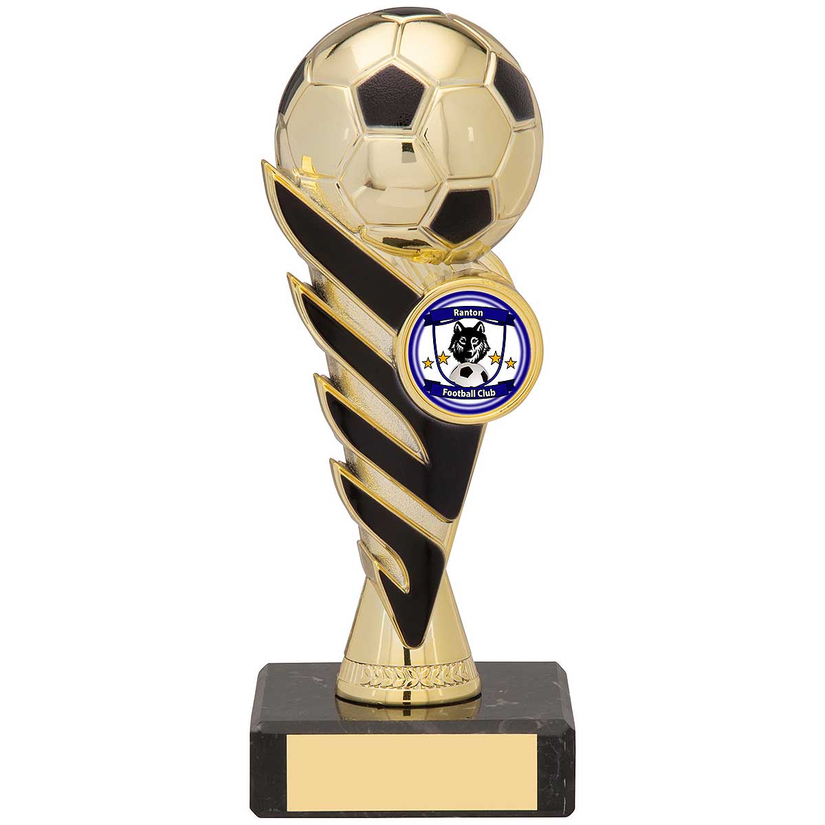 The bright gold & black plastic Pegasus football trophy retails at £6.75 each.