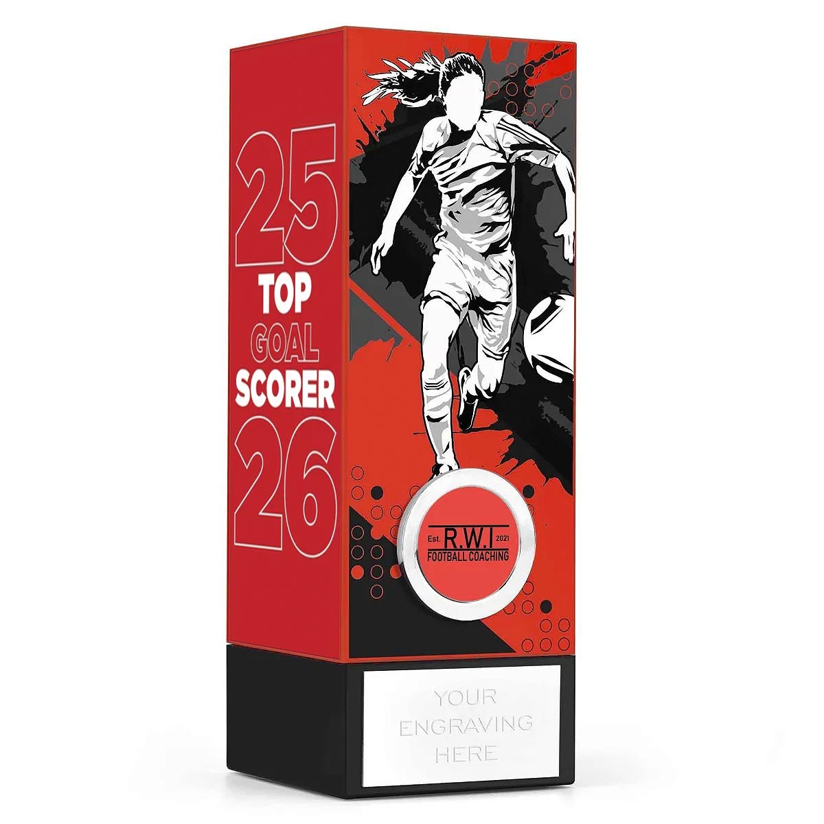 Red Geo Block 6cm square plain plastic column, 17cm tall. Weighted 0.6kg black base to give it a quality feel with felt foot.Comes with Female Top Goal Scorer highlight panels