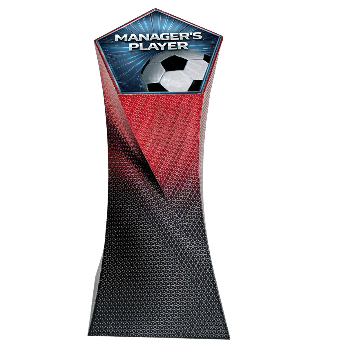 A striking and stylish large modern heavyweight hard shell football trophy with a red 5 sided column. With an eye-catching premium look this sleek black and red award is a smart presentation trophy. Managers Player decal on the top.