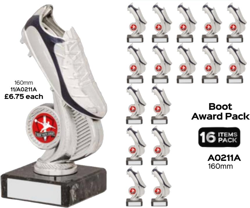 The bright silver & black plastic boot trophy retails at £6.75 each.