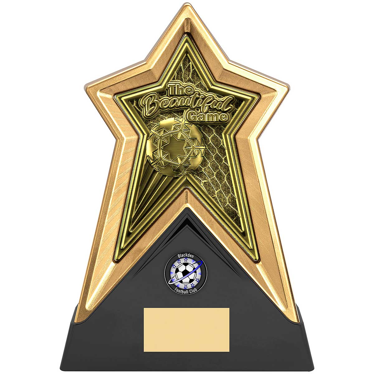 22cm gold Starforce stands proud and sturdy with a large star shapeHigh relief insert with male footballerEngraving plate and club logo can be applied.