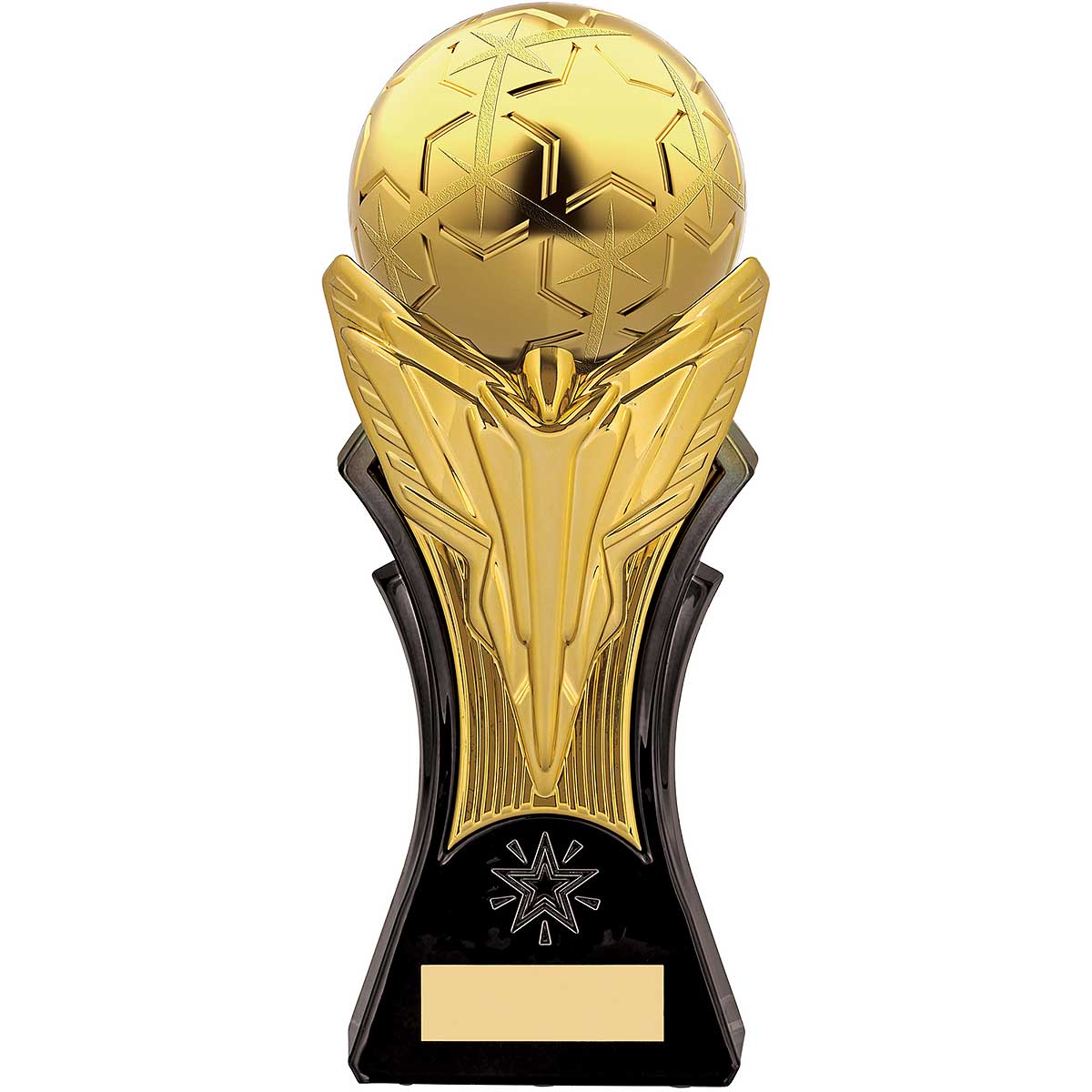 Victory Strike Metallic Gold Football Trophy. Stands 22cm tall on a black and gold column. Engraving plate and club logo can be applied.