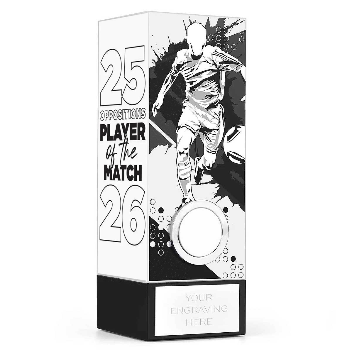 White Geo Block 6cm square plain plastic column, 17cm tall. Weighted 0.6kg black base to give it a quality feel with felt foot.Comes with Male Footballer & Opposition Player of the Match highlight panels