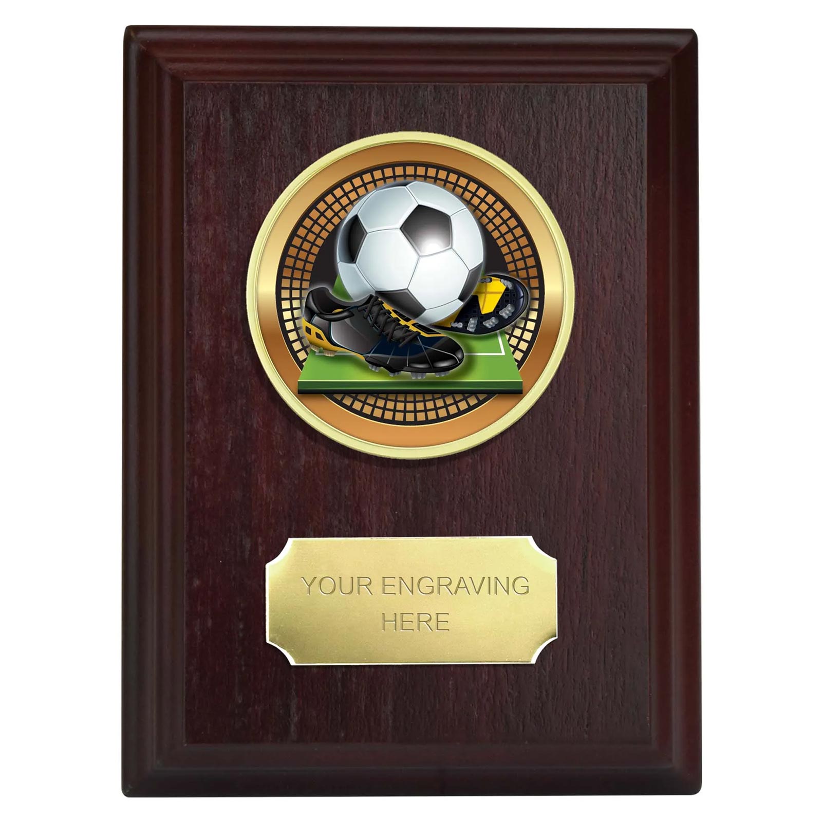 Wood Football Plaque 15cm with 50mm football disc and silver engraving plate